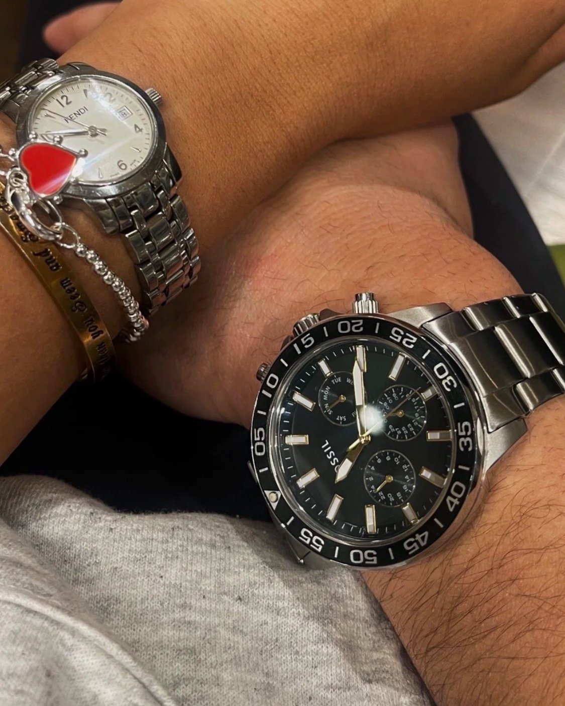 From what I've seen, the best way to mix and match is by integrating the metals into one outfit. Not just mixing in the different pieces you have on by staggering the metals. For example, matching a silver belt buckle with the silver hardware on your purse. But also incorporating both gold and silver bracelets, creating a balanced and intentional aesthetic. Look at @shop.with.caroline, she does it every day and looks incredible doing it.